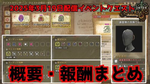 1つは装備品作成、残る2つは低タンク向けの装飾品クエストです。すでにHR100とか行っている人にはあまり美味しくないイベントなので、装備品だけは忘れずに作っておきましょう。いずれも3月26日までの配信です。