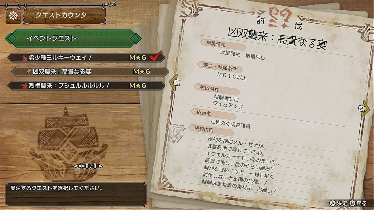 1つ目のクエストは「凶双襲来:高貴なる宴」。狩猟対象はイヴェルカーナと原初を刻むメル・ゼナです。狩猟場所が城塞高地なので、やや面倒なクエストになっています。