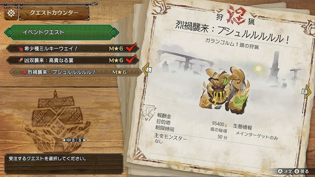 2つ目のクエストは「烈禍襲来:ブシュルルルルル!」です。原初を刻むメル・ゼナのイベクエ「キュラララララッ」並みにぶっ飛んだクエスト名ですね。狩猟対象はガランゴルム。場所が塔の秘境なので簡単にクリアできそうです。