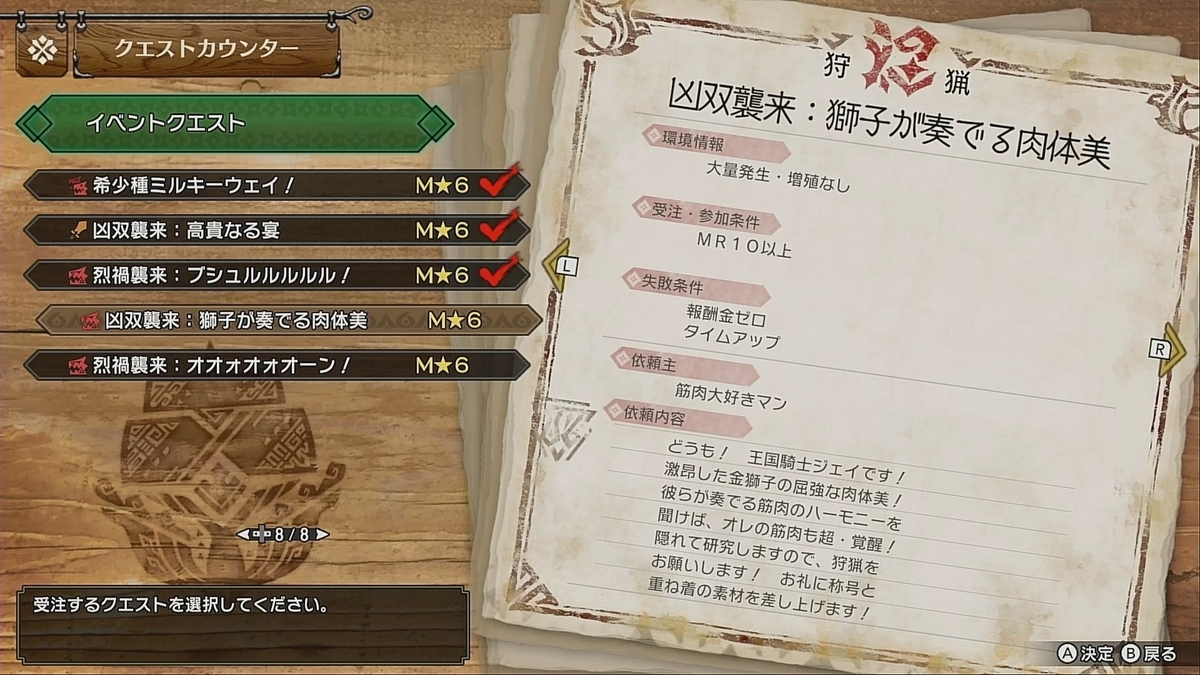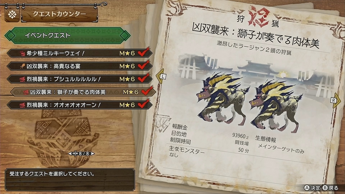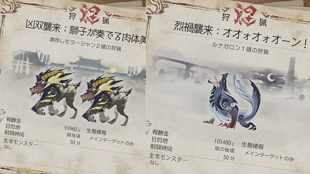 1つ目のクエストは「獅子が奏でる肉体美」。狩猟対象は激昂したラージャン2頭です。狩猟場所は闘技場。なんとなくアイスボーンの「嗚呼・嗚呼マッスルボディ」を思い出させるようなクエストになっています。