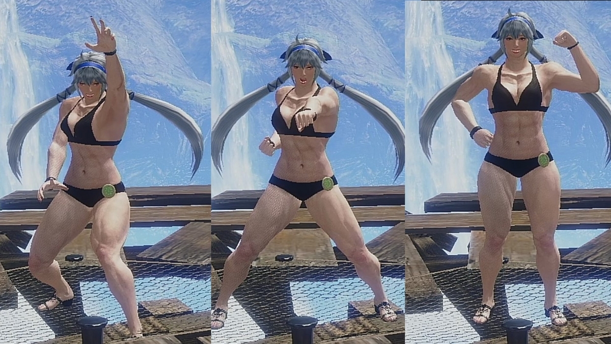 いつかのイベクエは健康的なマッスルボディでしたが、今回のマッスルボディはボディビルダーの大会でも通用しそうな筋骨隆々な感じに仕上がっています。ストリートファイターの春麗的な感じかな?