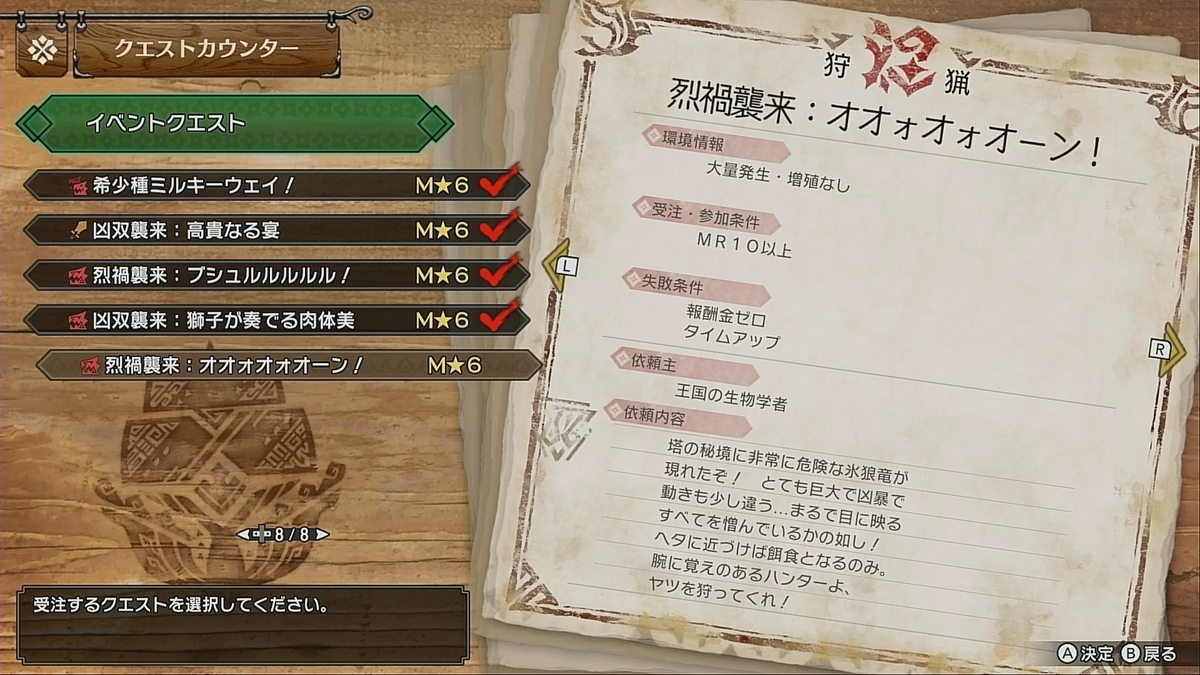 2つ目のクエストは「烈禍襲来:オオォオォオーン」。狩猟対象はルナガロンで、場所は塔の秘境です。原初を刻むメル・ゼナの「キュラララララッ!」・ガランゴルムの「ブシュルルルルル!」に次いでぶっ飛んだクエスト名が付けられています。