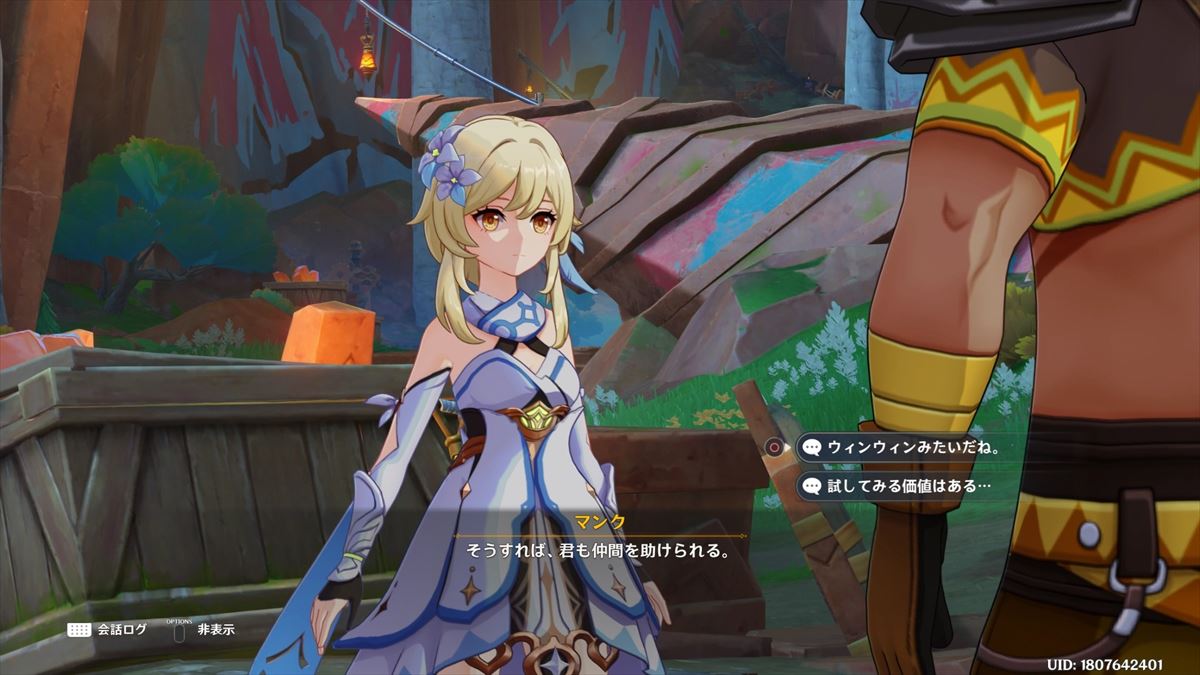 ちょっと探索していると、ウチのガルに対して物を申したいおじさんが話しかけてきました。ガルは訳あり個体だから~みたいなことを言っていましたが、とりあえず手放すつもりはありません。選択肢にウインウインという言葉がある当たり、最近のゲームだぁと思いました。