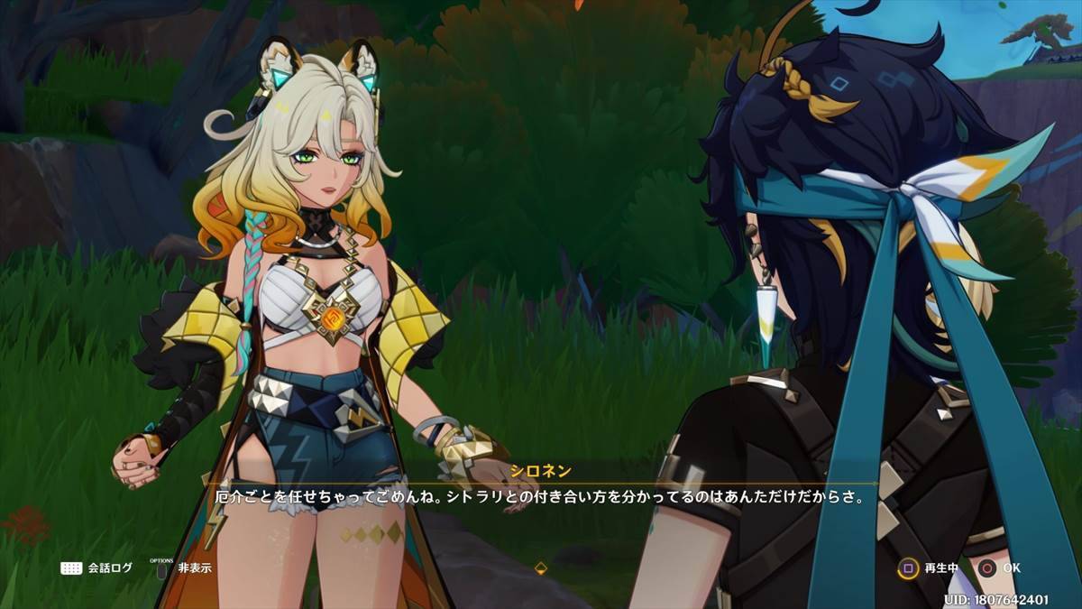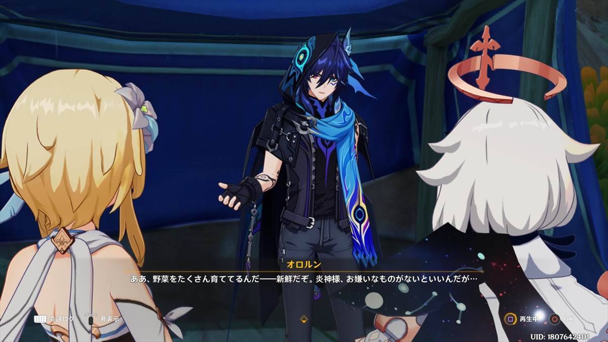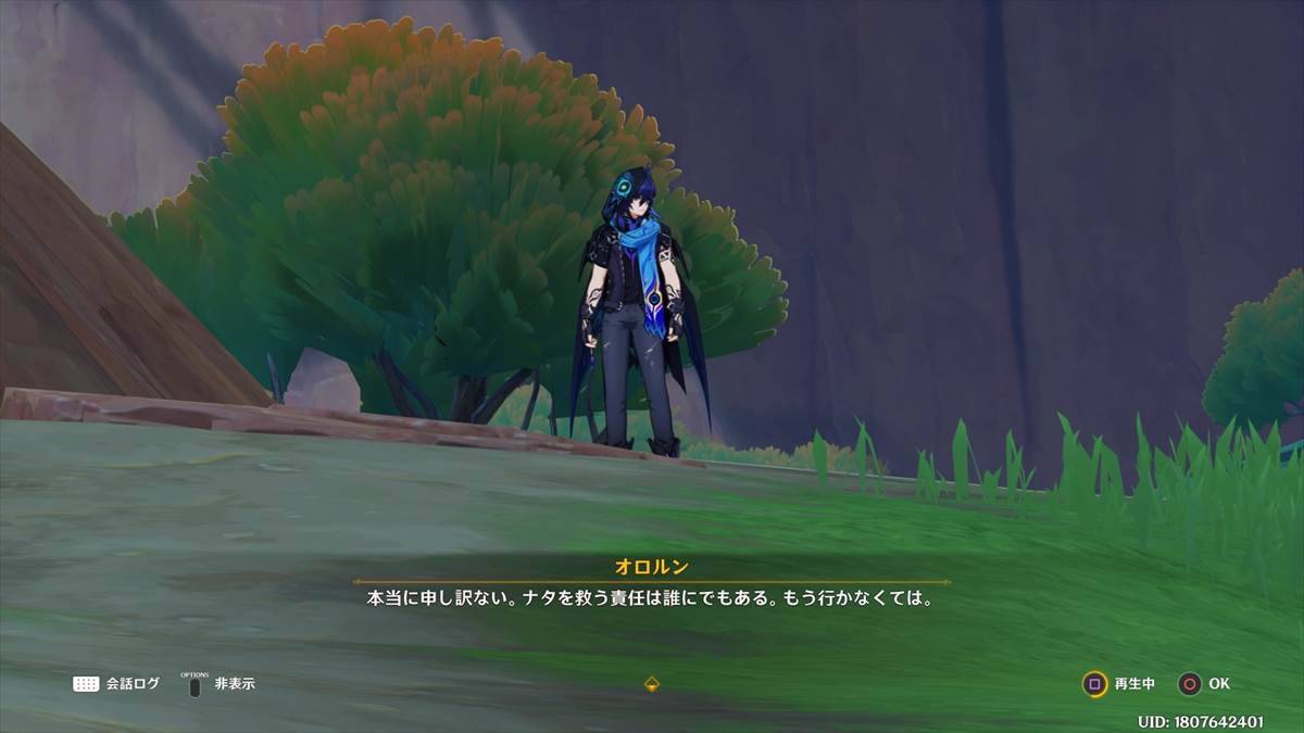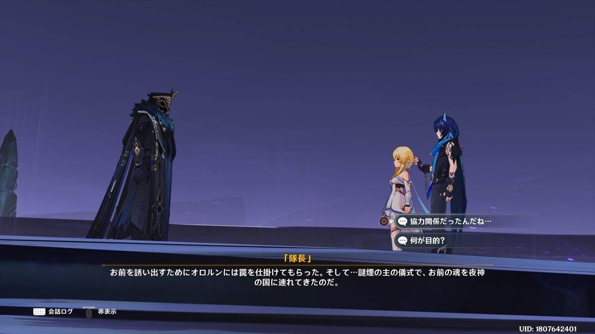 ちょっとイベントを端折ってオロルン・隊長・旅人・パイモンの4人で密会中。ファデュイ=敵という認識でいるのですが、この隊長さんはどうも敵っぽくない感じがします。厳密に言うと敵なのかもですが、少なくともナタにとっては敵じゃないような・・・。これが演技だったら・・・。マーヴィカにはマーヴィカの、隊長には隊長のやり方でナタを救おうとしているみたいですね。
