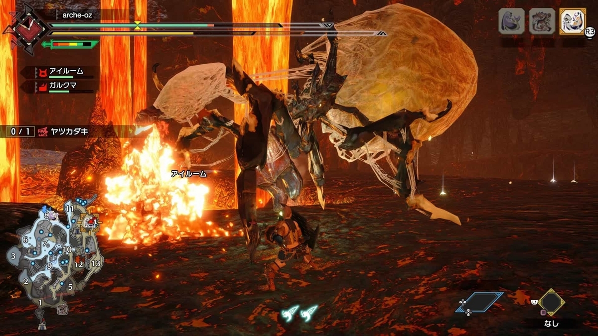 ヤツカダキの攻撃で注意したいのは糸で拘束する攻撃です。これ自体にダメージがあるわけではありませんが、この状態で炎ブレスを喰らうと大ダメージになります。レバガチャか消散剤で解除しましょう。レバガチャでも間に合うと思いますが、モーションの最後の方で喰らうと間に合わないかもしれません。