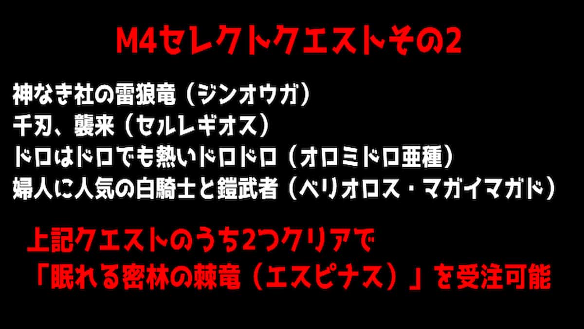 M5に上がるための緊急クエストその2を受注するには、画像の4つのセレクトクエストの中から2つをクリアする必要があります。どれを攻略してもいいですが、セルレギオスとオロミドロ亜種は初登場モンスターなので、戦ってみてもいいと思います。