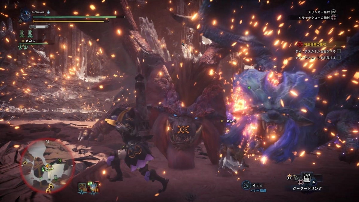 「平伏するより他に無し」は、龍結晶の地でテオ&ナナ夫妻の連続狩猟をするクエストです。このクエストの嫌なところは2体が同時に出現しているところ。1体ずつなら何とかなっても2体集まるともう地獄絵図です。レイア&レウス同様、よく合流するのでホントに厄介!
