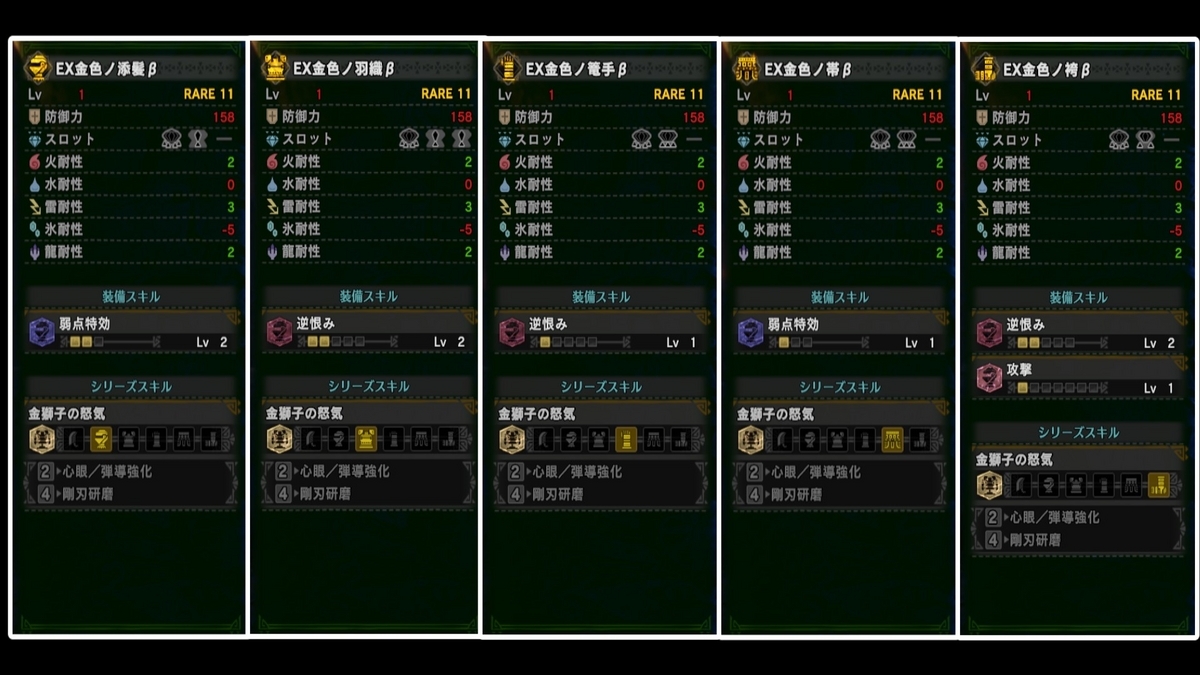 頭・腰のαで弱点特効3・匠3というのも面白そうですが、スロットが・・・。残りの部位をカイザーにすれば、達人芸で白ゲージを維持しながら戦えなくもない気がしますね。ちょっと微妙かな?