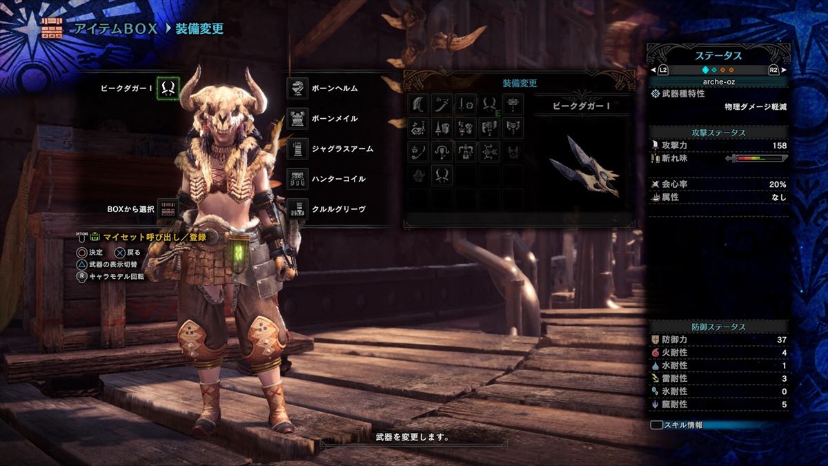 防具は上からボーン・ボーン・ジャグラス・ハンター・クルルです。防御力は37もあります。先程のレザー一式に比べて約3倍もの防御力を手に入れました!見た目は完全に蛮族ですが・・・