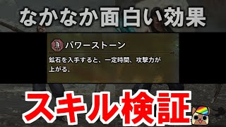 ピッケル武器には専用スキル「パワーストーン」が付いています。効果は、鉱石を入手すると一定時間攻撃力が上がる(鉱石のレア度が高いほど上昇値が大きくなり、上昇値には上限がある)とのことです。