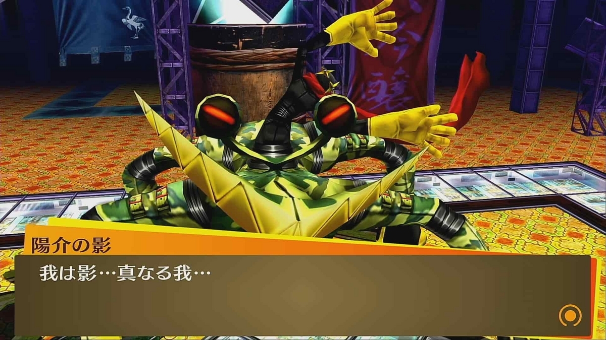 影の言うことを否定すると真の姿が登場。スクショのタイミングが悪くてちょっと間抜けな格好になっていますね。カエルの上に人が乗っているような・・・。今回は仲間がいないので、コイツの相手は主人公だけで行います。