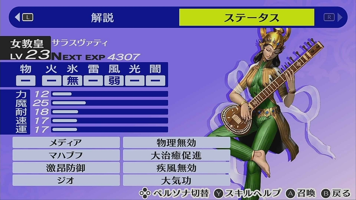 攻撃がめっちゃ強いというわけではないのですが、弱点はなくなっているし回復はできるしで使い勝手が良かったです。レベルアップで中気功を覚えるので、それだけでも使う価値があるペルソナだと思っています。