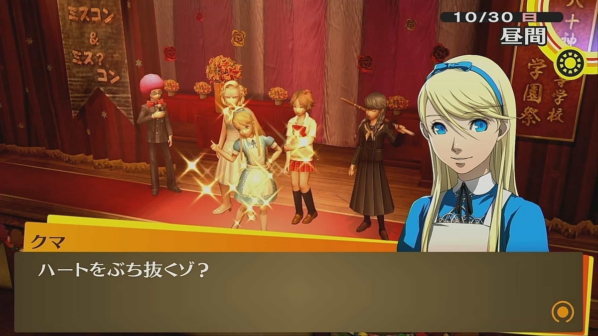旅館で泊まった次の日はジュネスでハロウィンの飾りつけを手伝わされます・・・が、実は中止になっていました。衣装はもらえるので、着替えさせて遊びましょう。