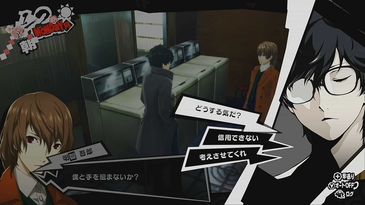 なんやかんや話をしていると明智が登場し、この世界おかしくない?みんな普通にしているけど普通じゃないよね?ってことを言ってきます。何者かがこの現実を作り出しているならそれを止めようと言うことで、手を組まないかと取引を持ちかけてくるので渋々了解。なんかイチイチ上から目線で腹立つなぁ。