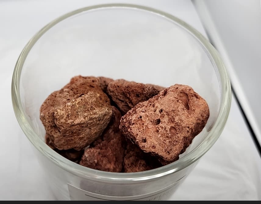容器に入れてみるとこんな感じです。容器の中に入れる前に石は水洗いしてあります。触ってみるとわかりますが、砕いた直後に梱包しているのか粉っぽさを感じたので、気になる方は水洗いしておきましょう。たぶん、問題ないはずです。