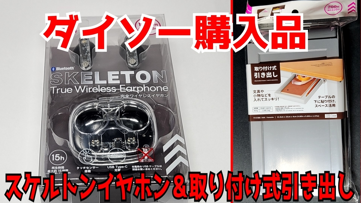 本日はダイソーで購入した商品を紹介していきます。今回購入したのはスケルトンタイプのワイヤレスイヤホンと取り付け式引き出しです。どちらも購入したばかりですが、使ってみた感想やレビューをしていきたいと思います。