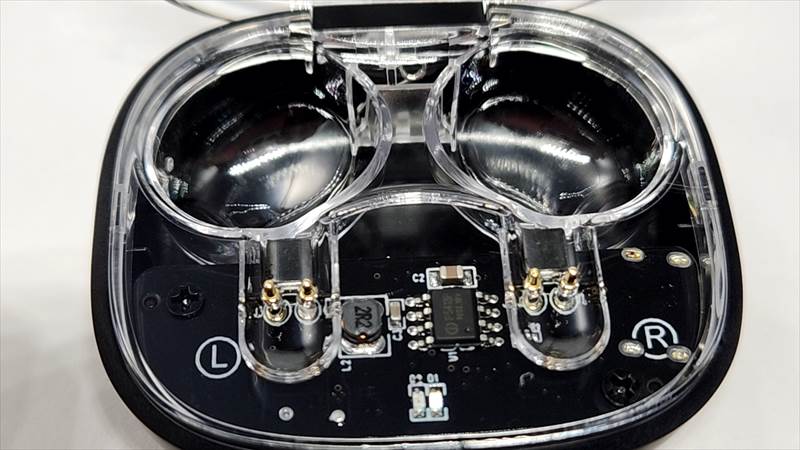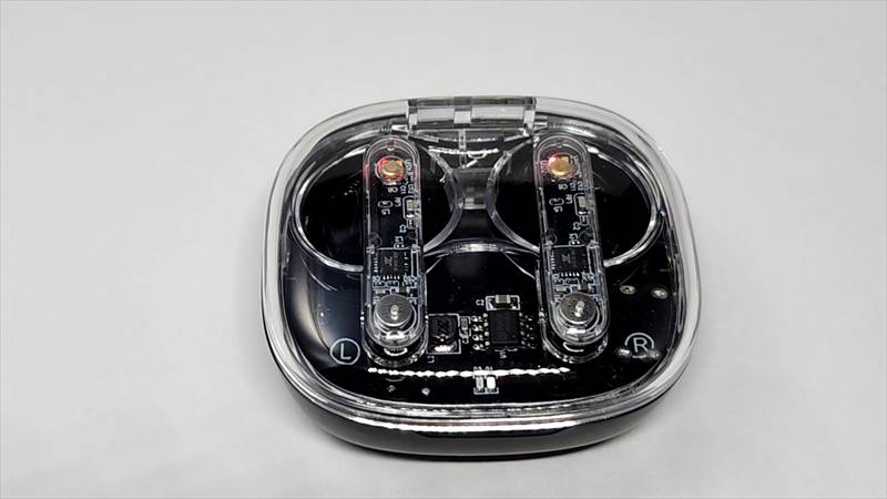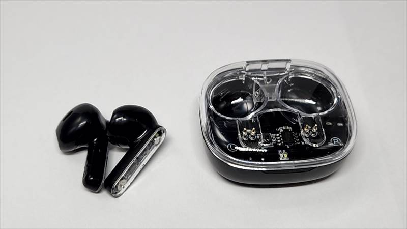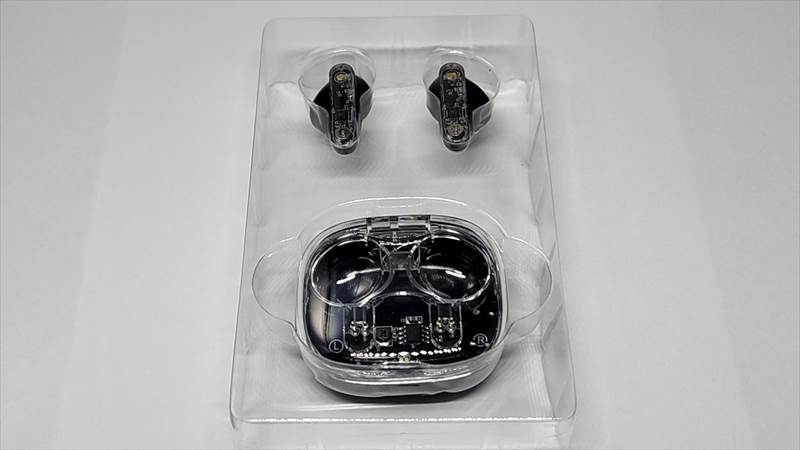 取り出した時の画像です。ケースは表の面がスケルトン、イヤホンは外側に向く部分だけがスケルトンになっています。一部分だけとはいえ、十分おしゃれに見えます。ちょっと分かりにくいですが、インナーイヤータイプです。