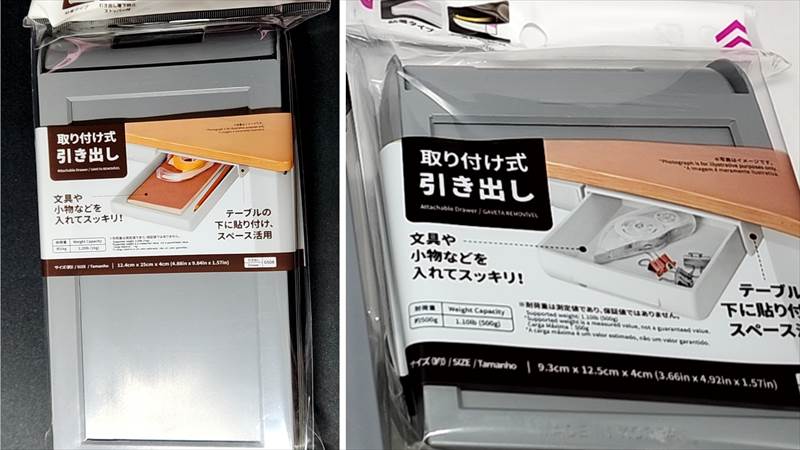 この商品は机などの下に両面テープでくっつけて引き出しにするというもので、サイズが2タイプあります。サイズは以下のとおりです。